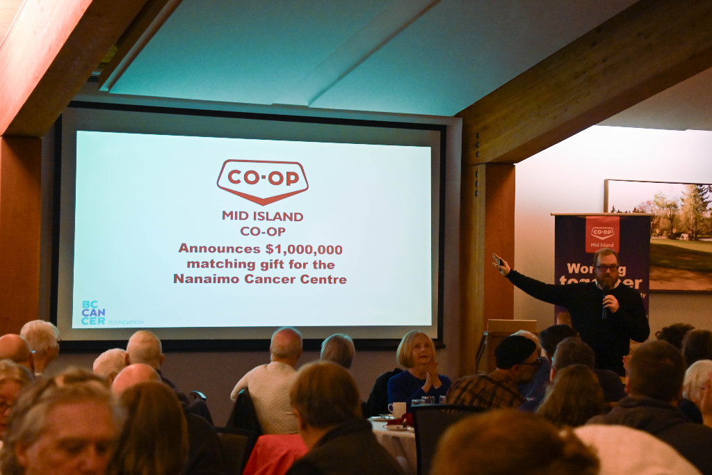 After dinner, William Litchfield from the BC Cancer Foundation spoke about the new cancer care facility that will be opening in Nanaimo in 2028. As part of our community giving, Mid Island Co-op has allocated $1 million split over five years to be put towards to completion of the facility. Once finished, the BC Cancer Centre will be able to support 20,000 radiation treatments per year, allowing patients in the Mid and North Island areas to access the care they need without having to travel to Victoria.